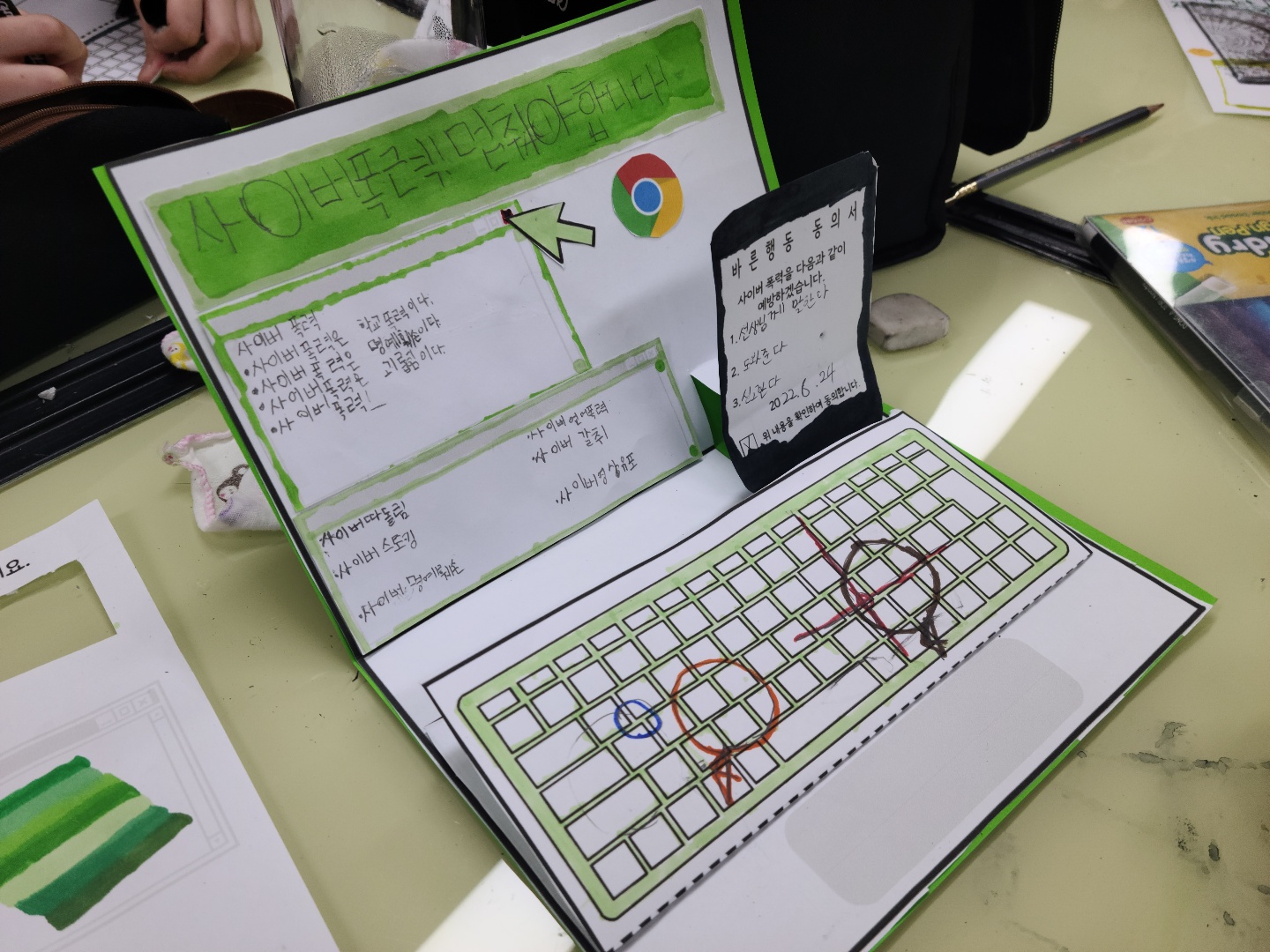 그리고 배운 내용을 바탕으로 사이버폭력 예방 문구 및 사이버폭력을 예방하기 위한 다짐들을 적어 작품을 만들어 보았습니다.
